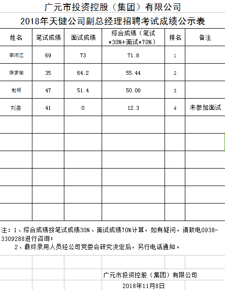 廣元市投資控股(集團(tuán))有限公司2018年天健公司副總經(jīng)理招聘考試成績(jī)公示表